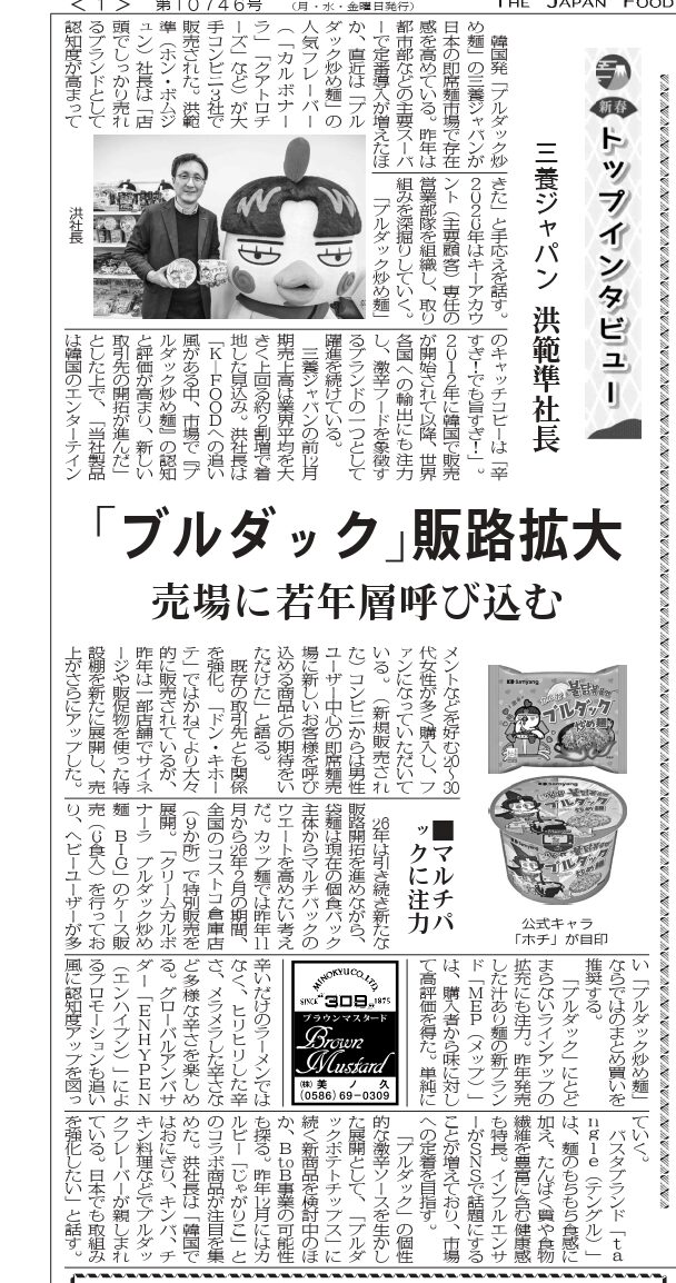 2026年1月19日付の食品新聞『「ブルダック炒め麺」販路拡大 売り場に若年層呼び込む』において掲載されました。https://news.yahoo.co.jp/articles/53dd57b32662dfbbba6aee0238c057ddfb152d71