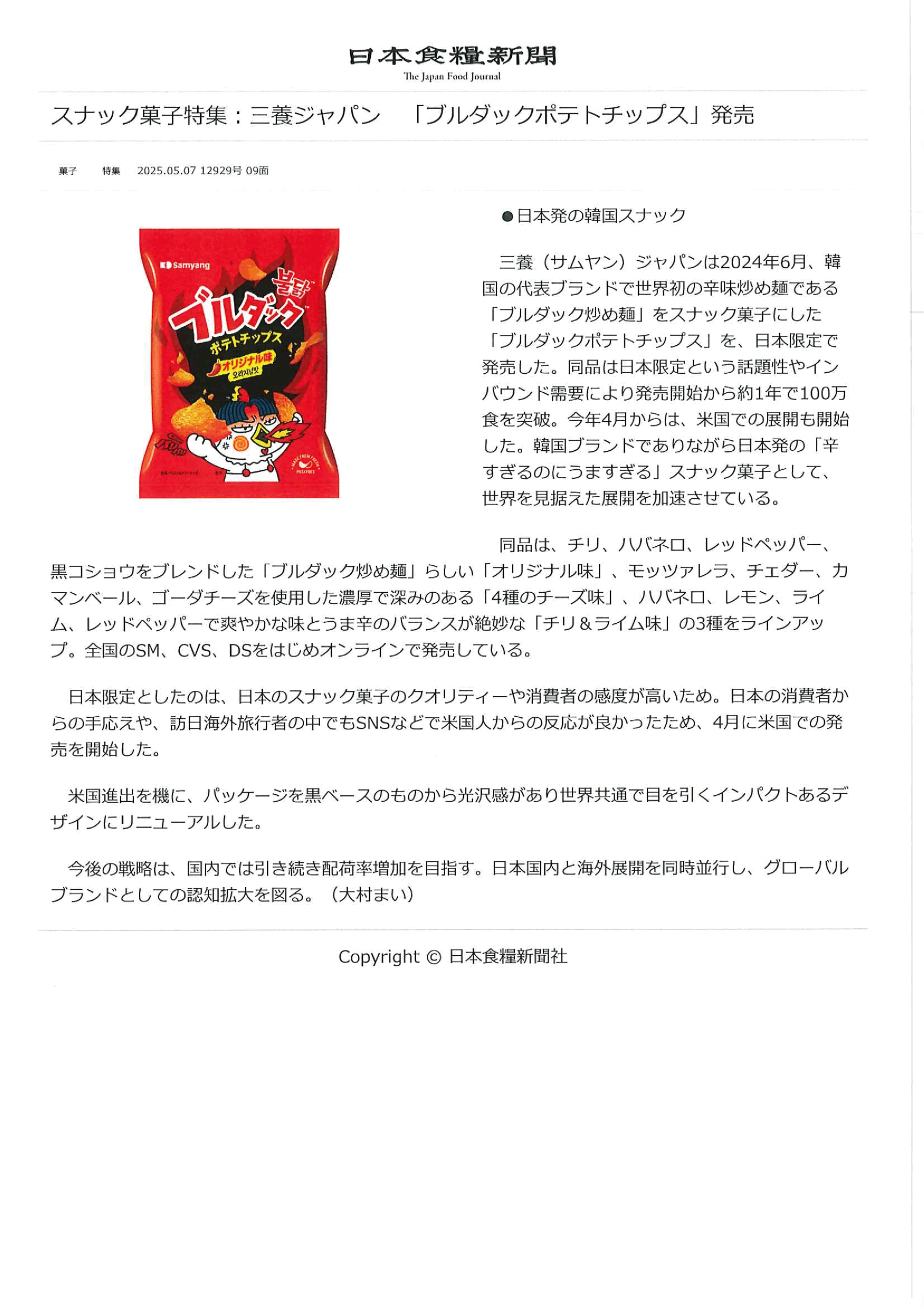 2025年5月7日付の日本食糧新聞『スナック菓子特集:三養ジャパン「ブルダックポテトチップス」発売』において掲載されました。https://news.nissyoku.co.jp/news/omuram20250422050515245